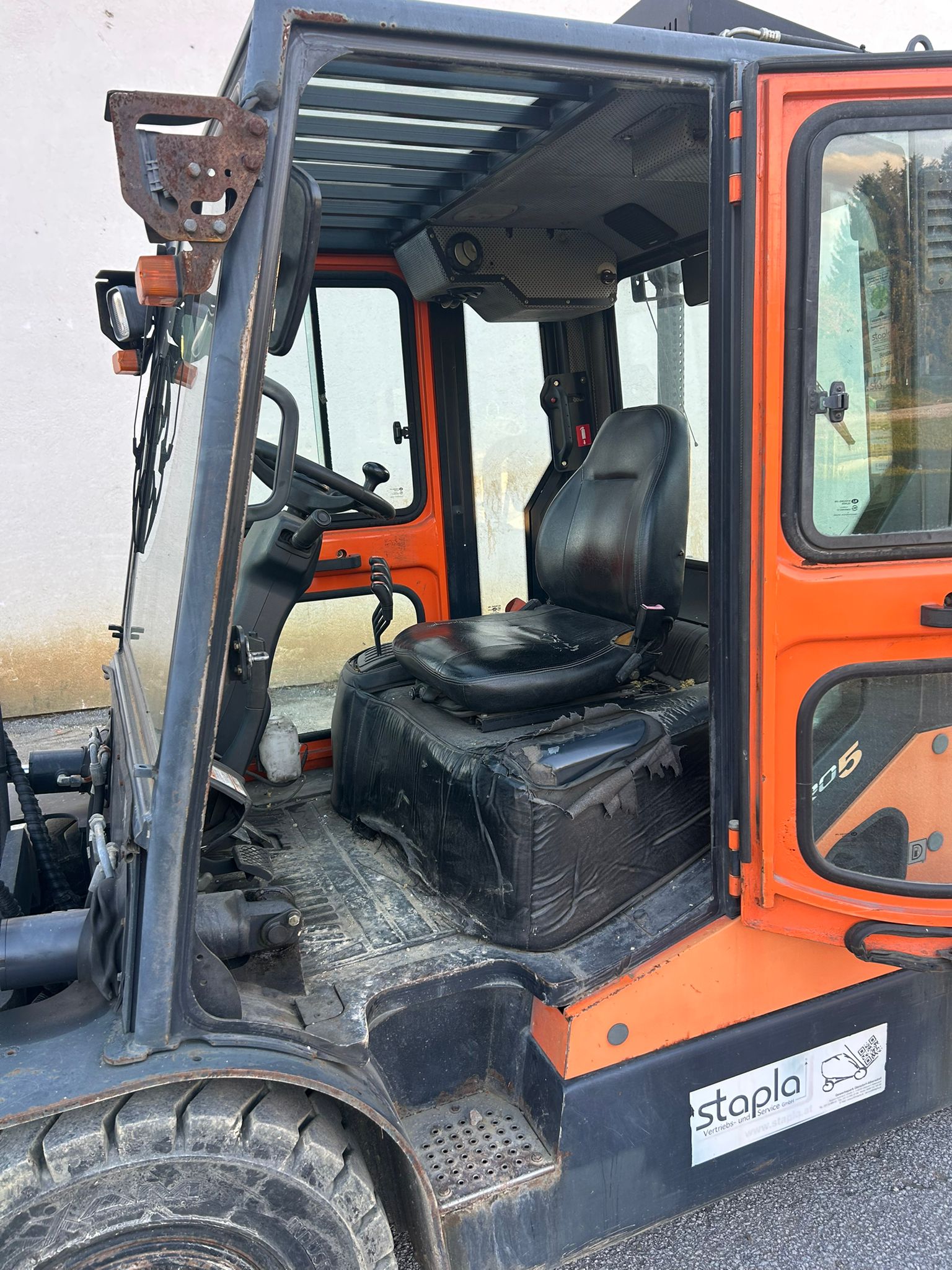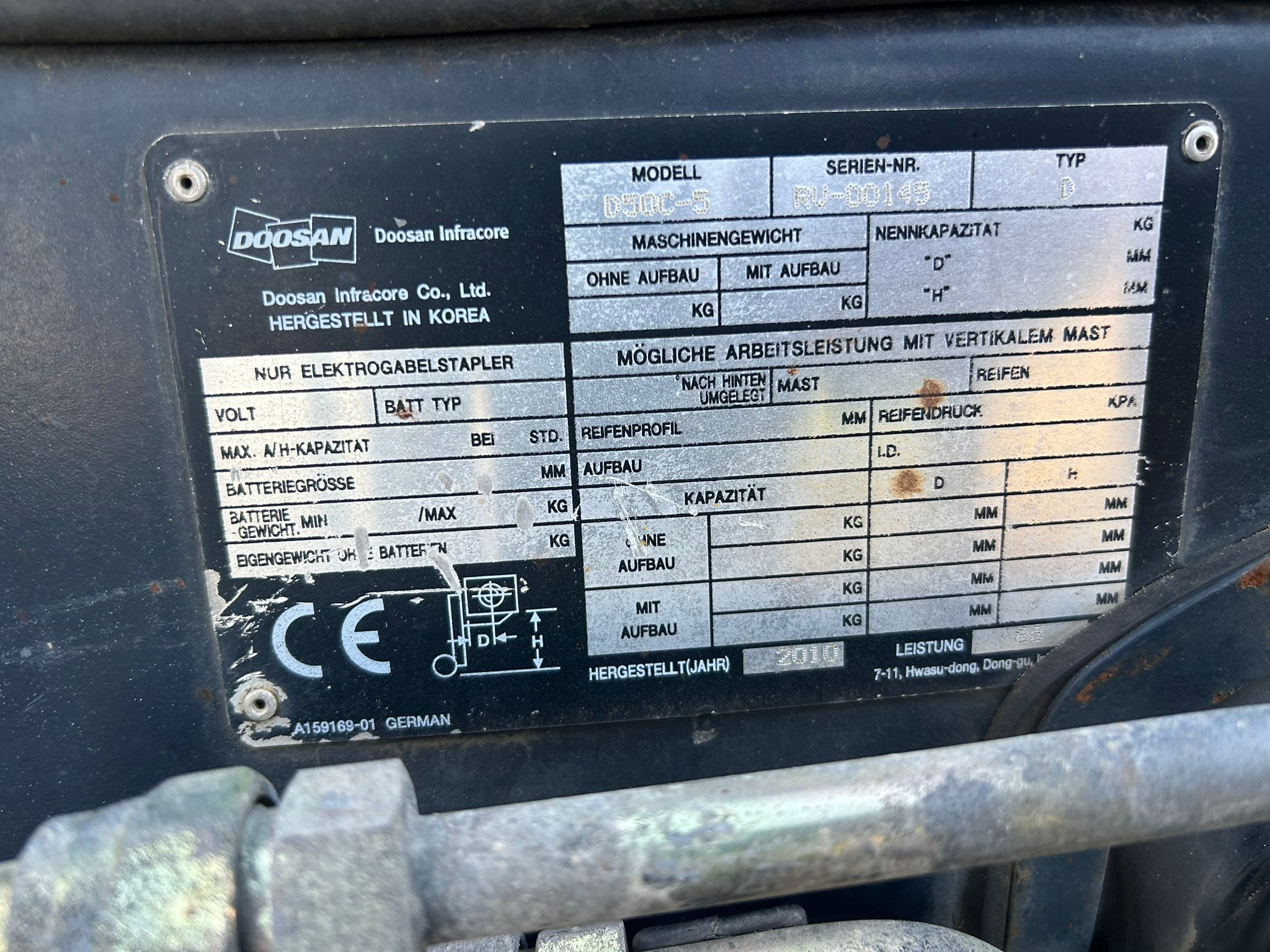 Hersteller: Doosan Typ: D50SC-5 Bauart: Dieselstapler Antriebsart: Diesel Tragkraft: 5000 kg Baujahr: 2009 Stunden: 10212 Zustand: |